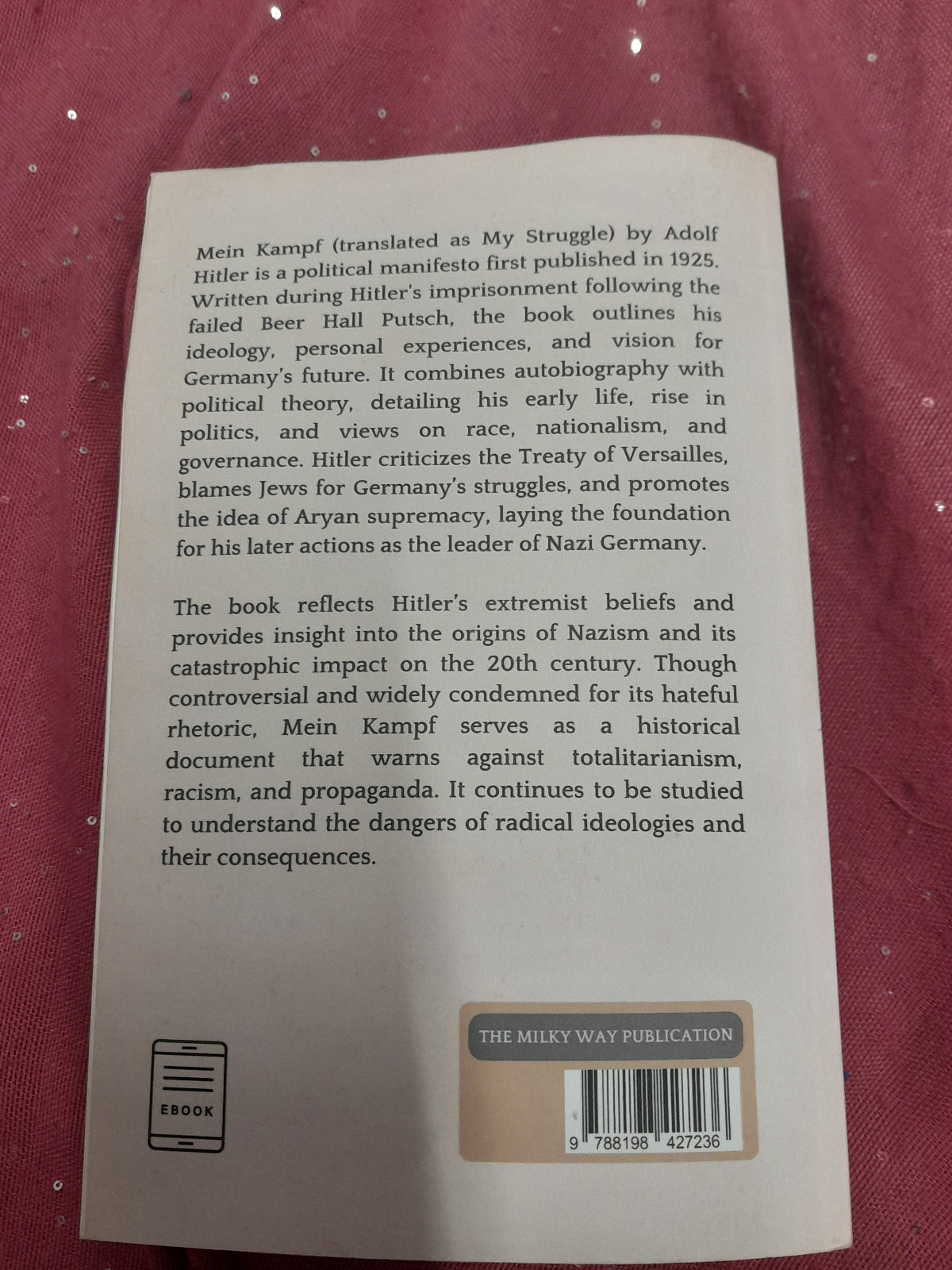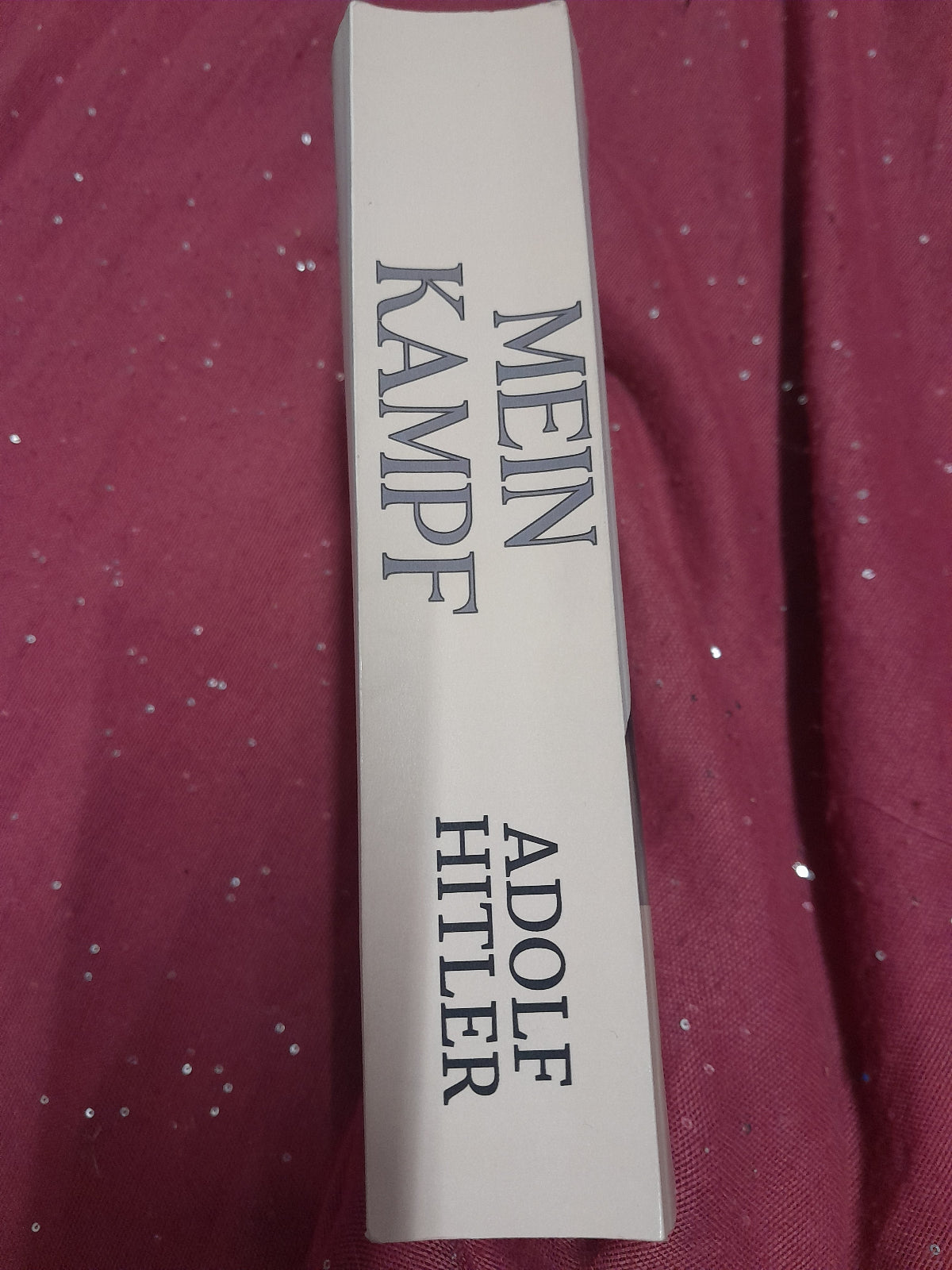 Label for 'Mein Kampf' by Adolf Hitler on a maroon fabric background