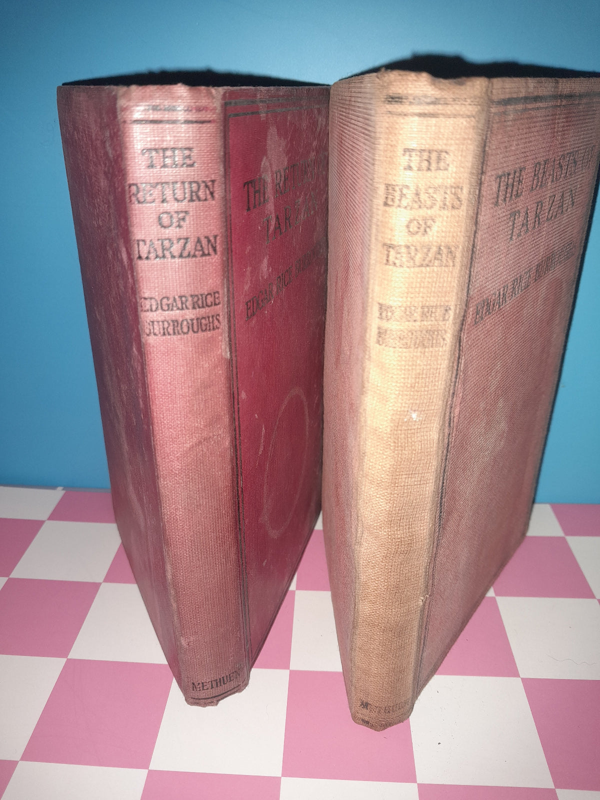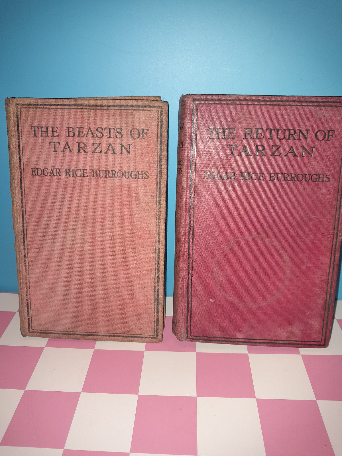 Two books titled 'The Return of Tarzan' and 'The Beasts of Tarzan' on a checkered background.